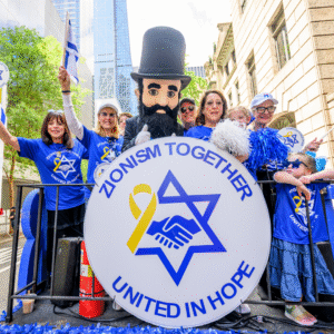 This year, AZM and WZO brought many of their constituents together as a “cluster,” with representatives from member organizations Amit, Ameinu, Mercaz, Hashomer Hatzair, and Habonim Dror as well as area synagogues Or Shalom, Hebrew Tabernacle, and Congregation Habonim. Hadassah, Young Judaea, ARZA and B’nei Akiva followed, making a delegation of upwards of 1,000 Israel supporters. In keeping with the Parade theme of “Picture Israel,” AZM members carried signs in the theme of “Visualizing Israel,” each featuring elements of how Israel has contributed to the Jewish community and to the world at large. Phrases included “Realizing Jewish Values,” “The Zionist Dream – Now a Reality,” “Using Science to Benefit All Humankind,” “Developing High-Tech Education” and more, visually unifying the group and underscoring the message.